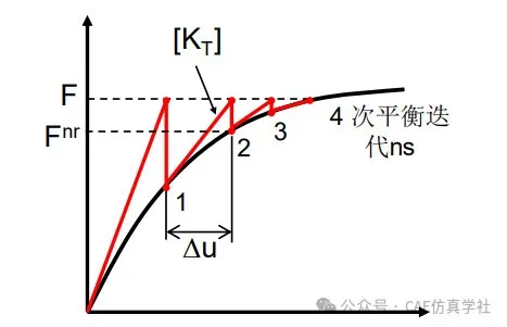 In ANSYS Workbench, the computational principle of Newton’s method is illustrated in the diagram below. In the first iteration, the total load Fa is applied. The displacement result x1 is obtained. Based on this displacement, the internal force F1 is calculated. If Fa≠F1, the system is unbalanced. Therefore, based on the current conditions, a new stiffness matrix is calculated (the slope of the dashed line). The value of Fa-F1 is referred to as the unbalanced force or residual force. When the residual force reaches a sufficiently small value, convergence is achieved. Thus, it is necessary to set several substeps within one load step to incrementally load and ultimately achieve convergence.
