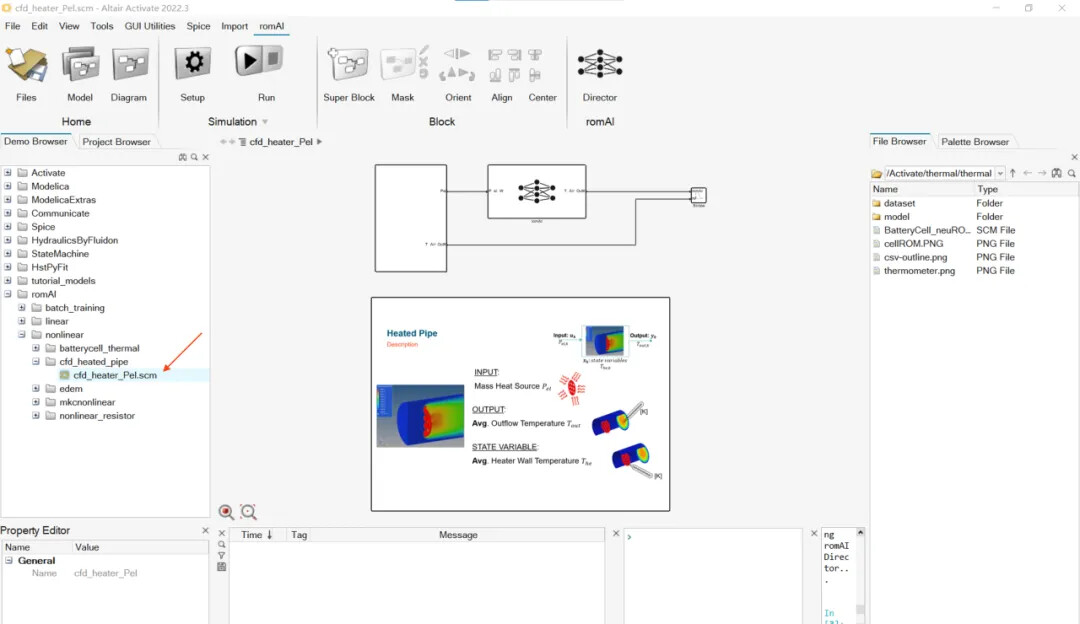 打开Activate模块,在Demo Browser目录下找到 romAI → nolinear → cfd_heated_pipe,这是一个简单的CFD管路加热模型,包含: