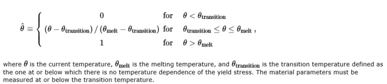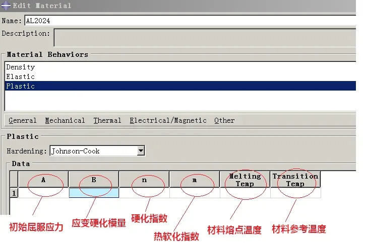 Below is the general expression of the Johnson-Cook model, where the main parameters to be determined are A, B, n, C, and m. As can be seen, the core of the Johnson-Cook model consists of three parts, representing material strain hardening, strain rate hardening (strengthening), and temperature softening, which can be summarized as “two hard, one soft.”