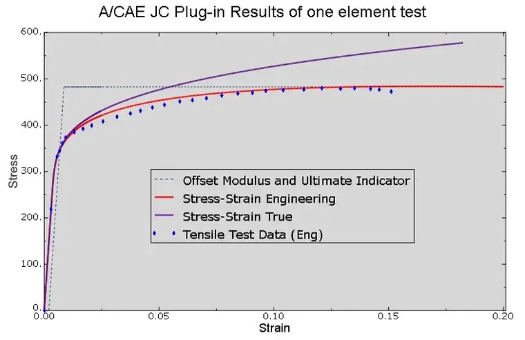 If we have determined the parameters A, B, and n, we can input the corresponding Johnson-Cook parameters in Abaqus. The key point is that, given the elastic modulus, Poisson’s ratio, yield stress, and ultimate strength of a material, we can use the JC plugin to automatically calculate parameters A, B, and n. Below is the stress-strain curve for aluminum alloy AL2024 obtained using the JC plugin.