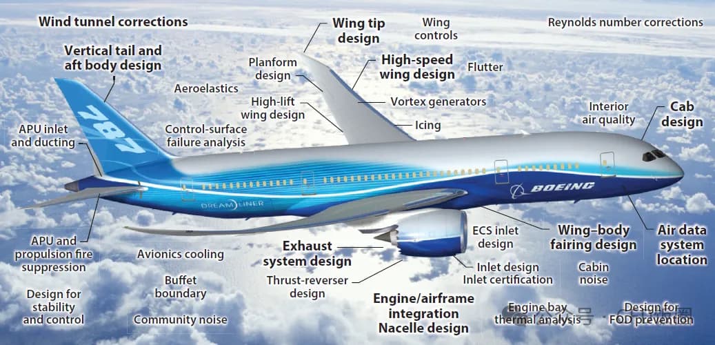 • Widespread CFD Use: By the time the Boeing 787 was designed, CFD technology had matured enough to be applied across a broader range of aircraft design areas. The review highlights CFD’s contributions to cabin noise, inlet design, regional noise, stability, and control design.
