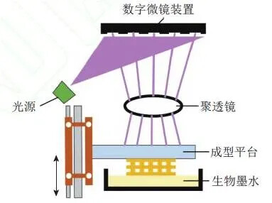 Photocuring-based 3D bioprinting is similar to laser direct writing but uses light to selectively crosslink bio-inks, layer by layer, to form a 3D structure. Ultraviolet (UV) light is selectively projected onto the surface of bio-ink using a digital micromirror device (DMD), and the exposed area of the material begins to cure. The forming platform moves up and down, and the process repeats layer by layer to create a complete 3D structure.