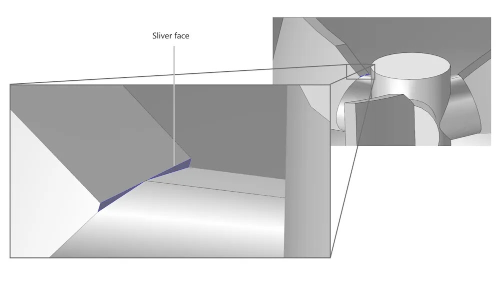 CAD 几何零件也经常不是非常吻合。下图显示了一个叶轮叶片,该叶片略大于和它相连的轴。如果我们保留这些长条面,网格单元需要与它们一致,这会导致长条面周围的网格非常密集。长条面通常比允许的最小单元大小小得多,因此附着在长条面上的单元往往呈高度各向异性并具有较高的偏度。由于长条面会产生单元质量较差的多余密集网格,因此应该将它们移除。