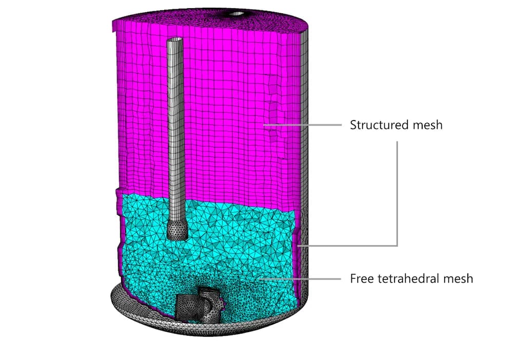 包含自由四面体网格区域和结构化网格区域的混合器模型。请注意,沿着壁的边界层网格是结构化网格
