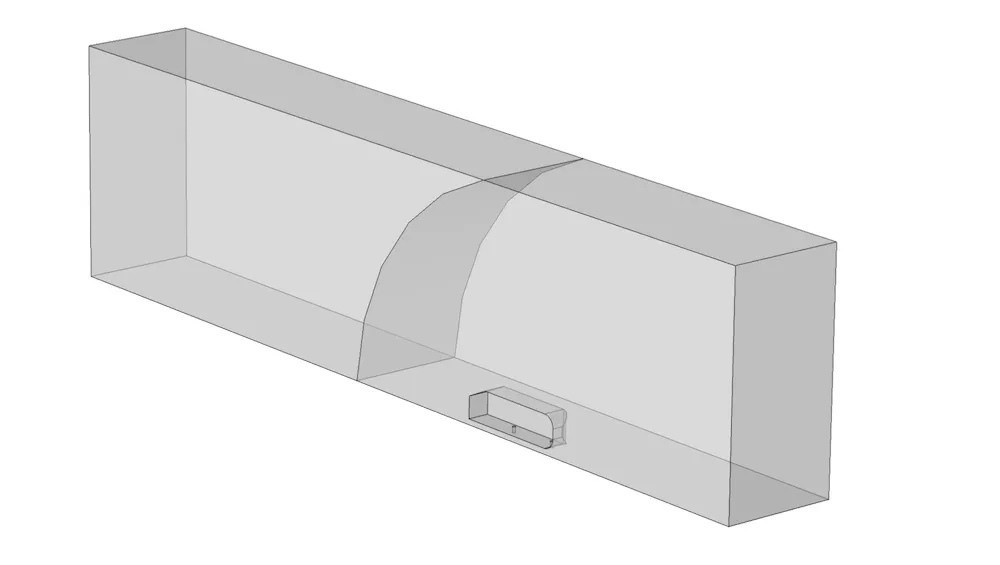 下面的屏幕截图显示了在 Ahmed 类车体后面添加的一个域,用于控制尾流中的网格大小。该域不会一直延伸到底部,因此如果不允许移动,在风洞地板上引入的边界层网格会在地板与外加域的底部之间被压扁。COMSOL® 软件具有所谓的网格控制实体,如汽车后面的网格控制域所示。