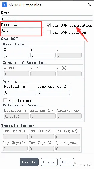 Double-click on the Dynamic Mesh in the model tree to enable Layering and Six DOF, and create the Six DOF properties as shown below.