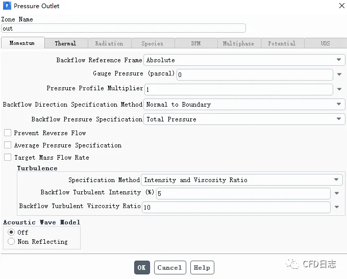 The outlet boundaries out and out2 are set as pressure outlets, as shown in the figure below.