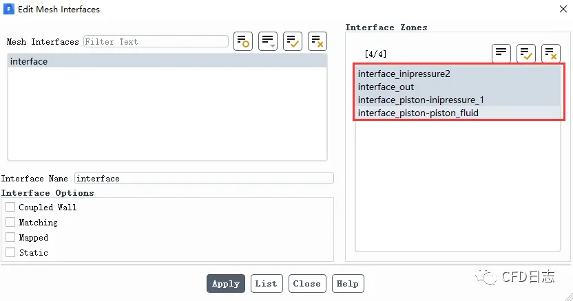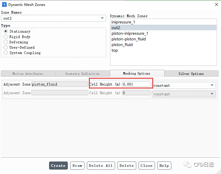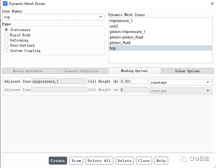 - The dynamic mesh regions and their parameter settings are shown in the images below.