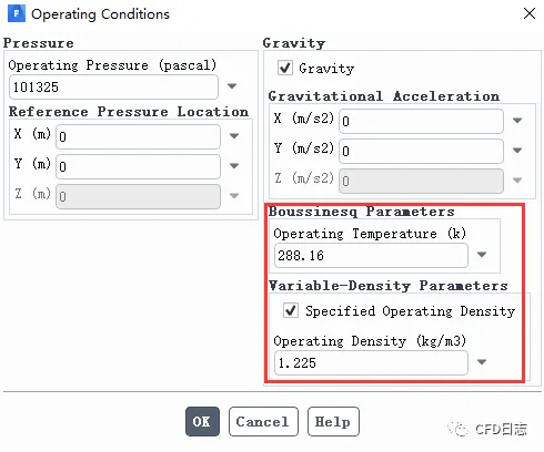 Click on the main menu bar, select Physics → Zones → Cell Zones, and set the operating conditions in the popup window as shown below.