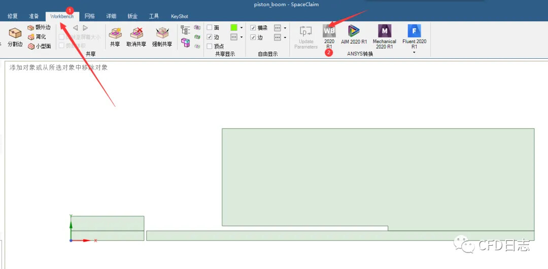 - Import the geometry from SCDM into Workbench. In the main menu, select the Workbench tab, then click on WB 2020 R1 to transfer the model into Workbench, as shown below.