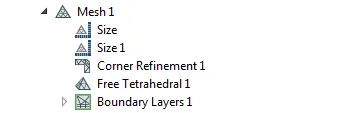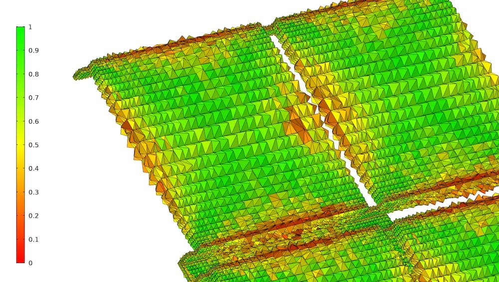 在 COMSOL Multiphysics 中,需要在为域划分网格之后添加边界层网格。各向异性棱柱或六面体单元被推入计算域,产生如下所述的多个高度的各向异性单元。结果表明,尽管这些单元呈各向异性,但质量良好。因为在这种情况下,边界层网格由高质量的三角形构建,同时产生了高质量的棱柱单元。