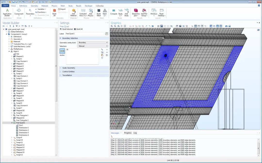 这个面也可以通过自由三角形网格操作划分网格,但那样会产生更多的单元。还可以看出,从相邻的映射网格测量的增长率并不是最好的。支架位于太阳能电池板的下侧,对流动的影响较少,因此网格主要影响模型的结构力学部分,对于这部分来说,增长率并非关键因素。