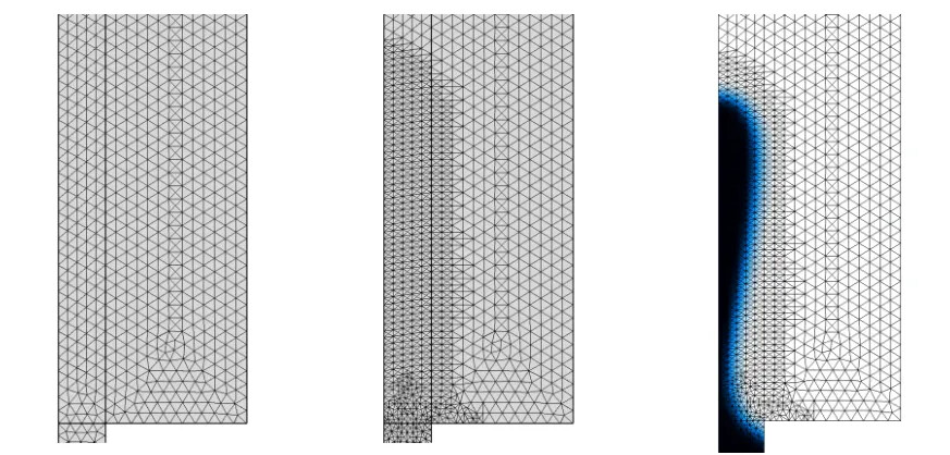 瞬态模型的自适应方式略有不同。基础粗化网格用于在一定时间间隔内推进求解。随后,使用求解结果基于某个指示函数来细化网格,并使用自适应网格再次模拟时间间隔。下图左显示了喷墨打印机喷嘴模型的基础网格,中间的图显示了自适应网格。由于这是一个两相模型,因此自适应基于进行,其中是水平集函数(0 位于一个相,1 位于另一个相)。右图显示了自适应时间间隔结束时的解。可以看到,细化网格如何在整个时间间隔范围内覆盖界面前方的传递。