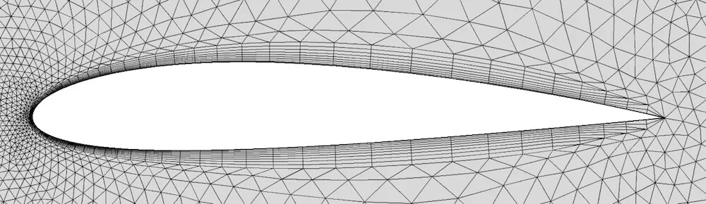 映射网格对于二维仿真特别有用,例如下图所示的 NACA 0012 机翼基准模型。此模型中的映射网格最显著的特性是它对单元大小、质量和增长率的极佳控制,即使它可能需要一些操作来指定所有边上的最优分布。