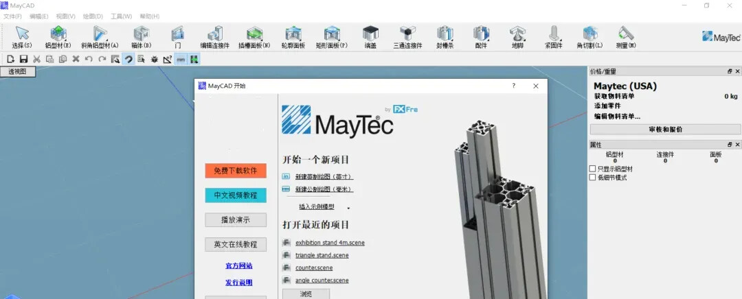 设计工具齐全:MayCAD 提供了多种设计工具,包括绘图工具、拖拽放置工具、连接工具等,使用户可以快速、准确地创建铝型材结构。
