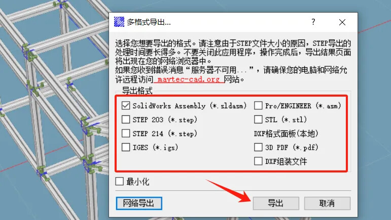 5、将制作好的铝型材架子导出(支持很多格式,比如SolidWorks文件、proe文件、step、xt等格式)