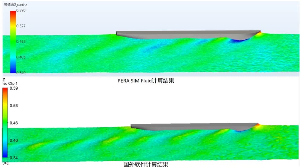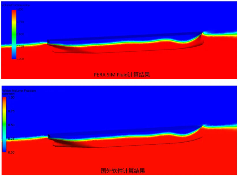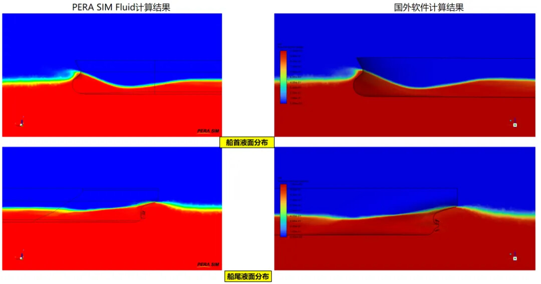 对比船首和船尾水相体积分数分布,可以看到PERA SIM Fluid对液面的捕捉具有较高的精度。
