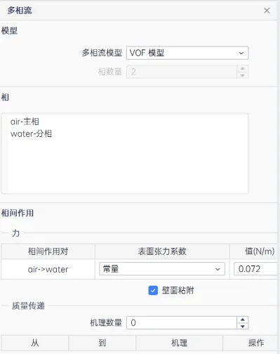 湍流模型使用SST k-ω湍流模型。在材料库中选择water-liquid复制,添加到可用材料中。选择VOF多相流模型,设置主相为空气,分相为液体水,相间作用力设置表面张力系数为0.072N/m。