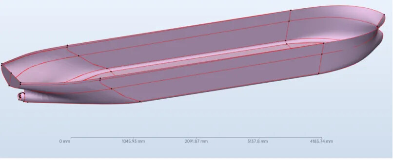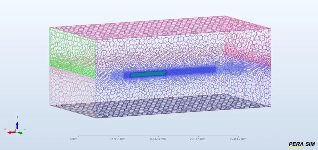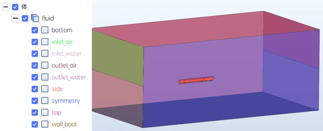 本次研究的船体外形如图2所示,使用PERA SIM Fluid前处理自动几何修复功能,形成封闭和几何实体,并建立外流体域。船体方向向前延伸1倍船长,船尾延伸3倍船长,宽度方向延伸两倍船长,利用分组功能定义计算边界,处理好的计算域如图3所示。