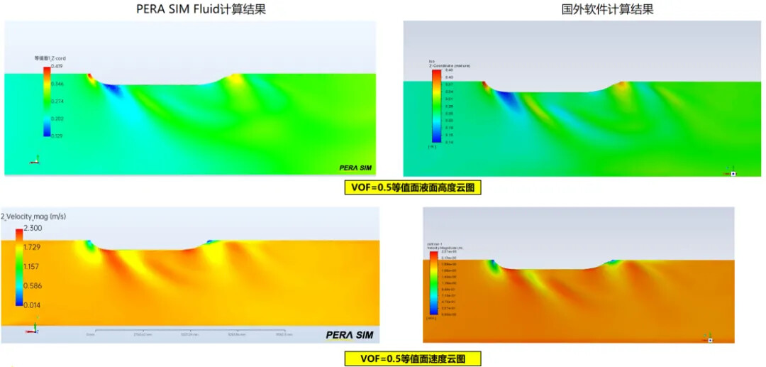选取VOF=0.5的等值面,与国外软件相比,液面高度和速度分布也一致,随着船的航行,船行波开始形成。