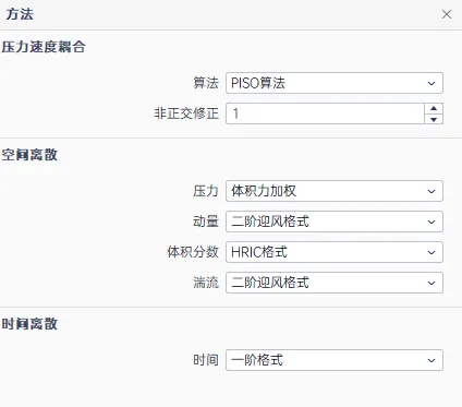求解方法选择PISO算法,压力离散格式为体积力加权,动量和湍流为二阶迎风格式,体积分数默认HRIC格式,时间离散为一阶格式。