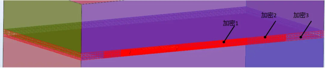 船体需要捕捉的最小几何特征为0.4mm,但不是特别关键位置,因此设置最小尺寸为0.2mm即可;对船体表面添加局部尺寸,控制最大尺寸为32mm;对船体近场流场网格和自由液面处网格进行加密,以捕捉船兴波的变化,为避免网格量过大,从近到远分为3个加密等级;船体表面添加5层边界层。