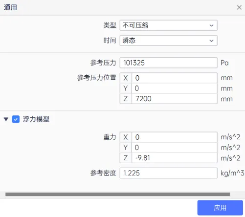采用瞬态计算,不可压缩流体,勾选浮力项,设置Z方向重力-9.81m/s2,参考密度1.225kg/m3,参考压力101325Pa,参考压力位置(0,0,7200mm)。
