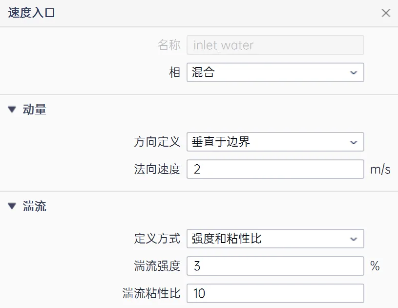 空气和水入口均改为速度入口,在混合相中设置空气和水的速度都是2m/s,切换为水相,设置空气和水入口水的体积分数分别为0和1。