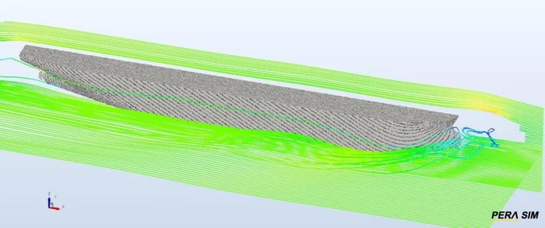 采用PERA SIM Fluid软件,利用VOF多相流模型,建立了船体阻力仿真模型,获得了船体周围详细的流场细节和阻力数值。