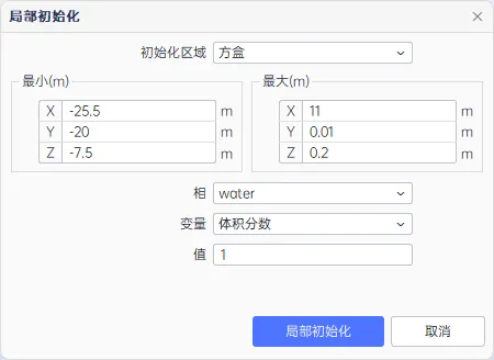 初始化设置X方向速度为-2m/s,使用局部初始化,设置初始水位以下区域水的体积分数为1。