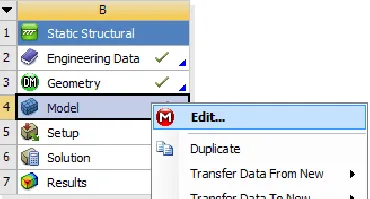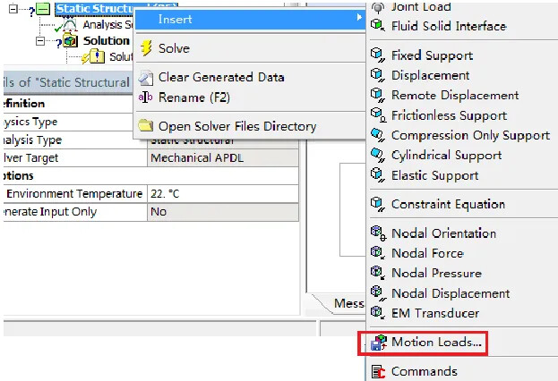 9. Import Motion Loads: Select the static structural branch, right-click, and choose “Insert > Motion Loads…” to import the loads from the previous file.