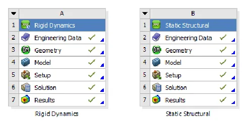 4. Copy the Rigid Dynamics Analysis System: In the project schematic, copy the rigid dynamics analysis system and replace it with a static structural analysis system.