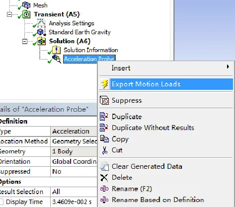 3. Export Motion Loads: Select a result object, right-click to choose “Export Motion Loads,” and specify a load file name.