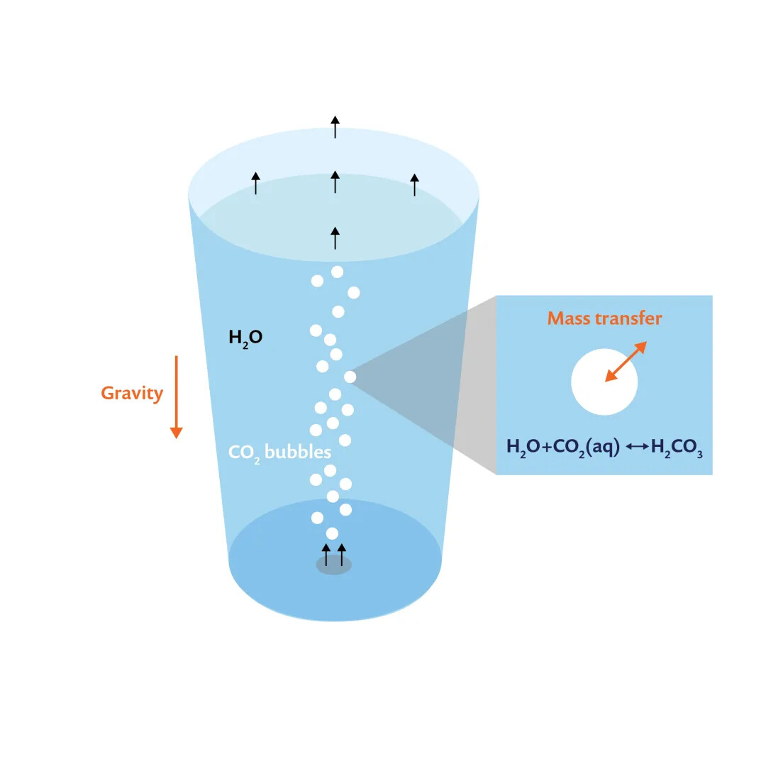As shown in the figure below, carbon dioxide is introduced from the bottom of a glass of water. Due to buoyancy, carbon dioxide bubbles rise and travel through the water, transferring mass and momentum, ultimately escaping through the surface. It is important to note that the dissolved carbon dioxide reacts with water to form carbonic acid. Therefore, to simulate and understand the carbonation process in a glass, we need to solve the following problems: