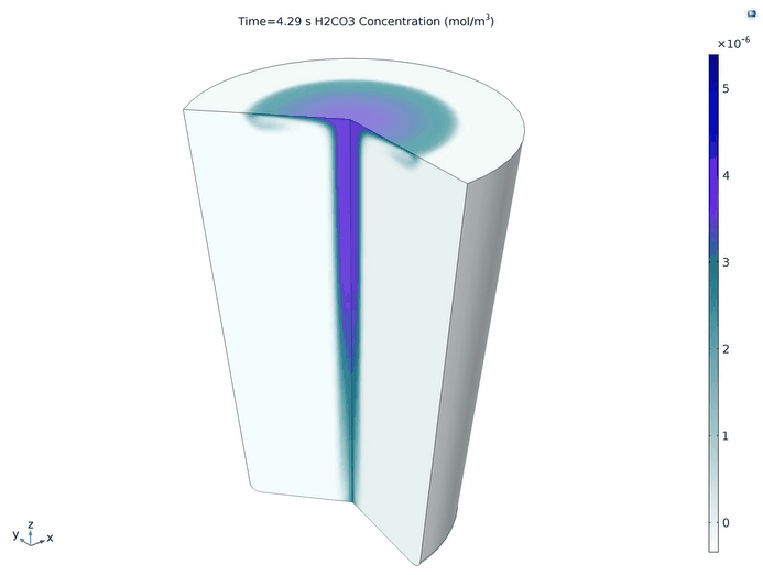 Since this is a 2D axisymmetric simulation, COMSOL Multiphysics automatically creates a 3D dataset, marking a transformation in the computation of 2D datasets. Therefore, we can create a 3D animation showing the evolution of carbonic acid over time, where the generation and transfer of carbonic acid are closely related to the transfer of aqueous carbon dioxide.