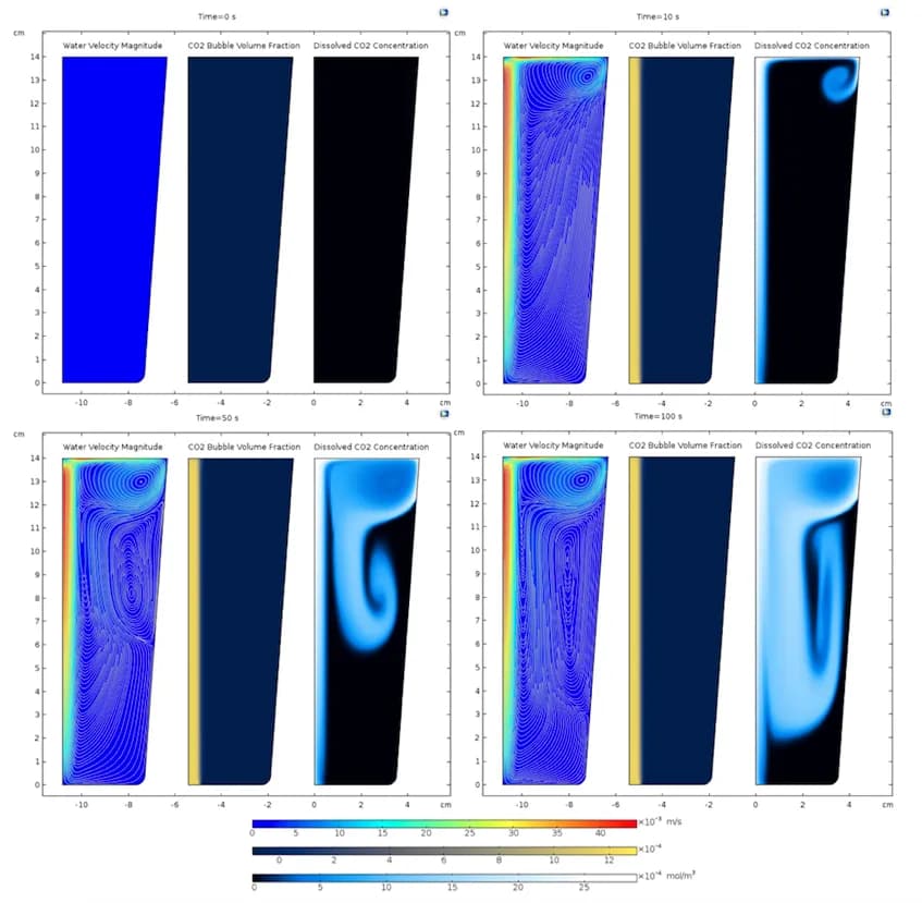 Bubbling is a mass transfer process between gas and liquid, commonly found in various industrial applications such as beverage carbonation and photobioreactors. Even the act of aerating a fish tank at home falls under this phenomenon. In this article, we will detail how to simulate the carbonation process, a type of bubbling phenomenon, using COMSOL Multiphysics® software.