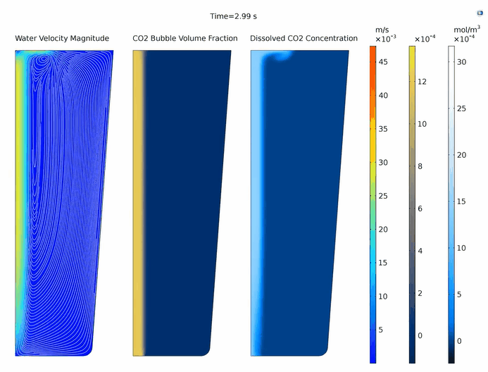 - The mass and momentum transfer of water and carbon dioxide bubbles, i.e., multiphase flow.