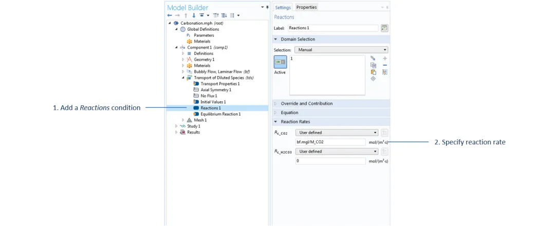The mass transfer from gas to liquid is the source of aqueous carbon dioxide, analyzed through the reaction term in the dilute mass transfer interface, as shown below. In addition to the coupling between the dilute mass transfer and bubbly flow interfaces, the liquid phase velocity calculated through the bubbly flow interface is conveyed in the transfer properties domain settings of the dilute mass transfer interface, which explains the convective transfer of aqueous carbon dioxide.
