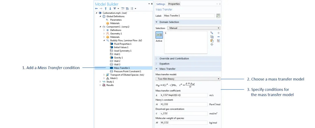 The bubbly flow and laminar flow interfaces can not only solve for velocity, pressure, and effective gas density but also compute the bubble number density and the associated interfacial area (when the option to solve for interfacial area is selected in the settings). Therefore, we can use the double-film theory to calculate the mass transfer between bubbles and the liquid, which will be discussed later.
