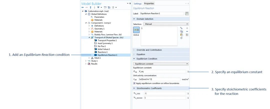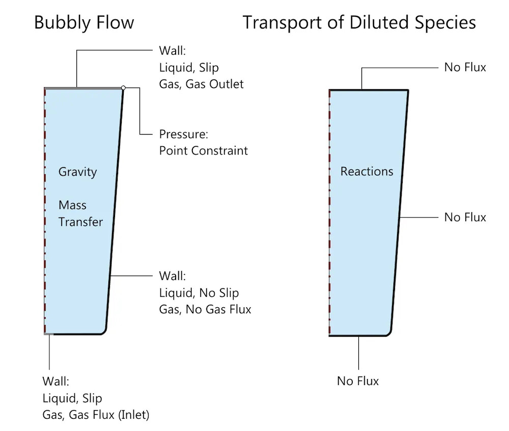 A schematic diagram of the problem setup in COMSOL Multiphysics, showing the boundary and domain conditions related to the bubbly flow and dilute mass transfer interfaces. The mass transfer of carbon dioxide is specified through reaction conditions, while the carbonation reaction is specified through equilibrium reaction conditions; both are represented as reactions in the schematic. Note: Default domain conditions, such as fluid properties, transfer properties, and initial values, are not indicated.