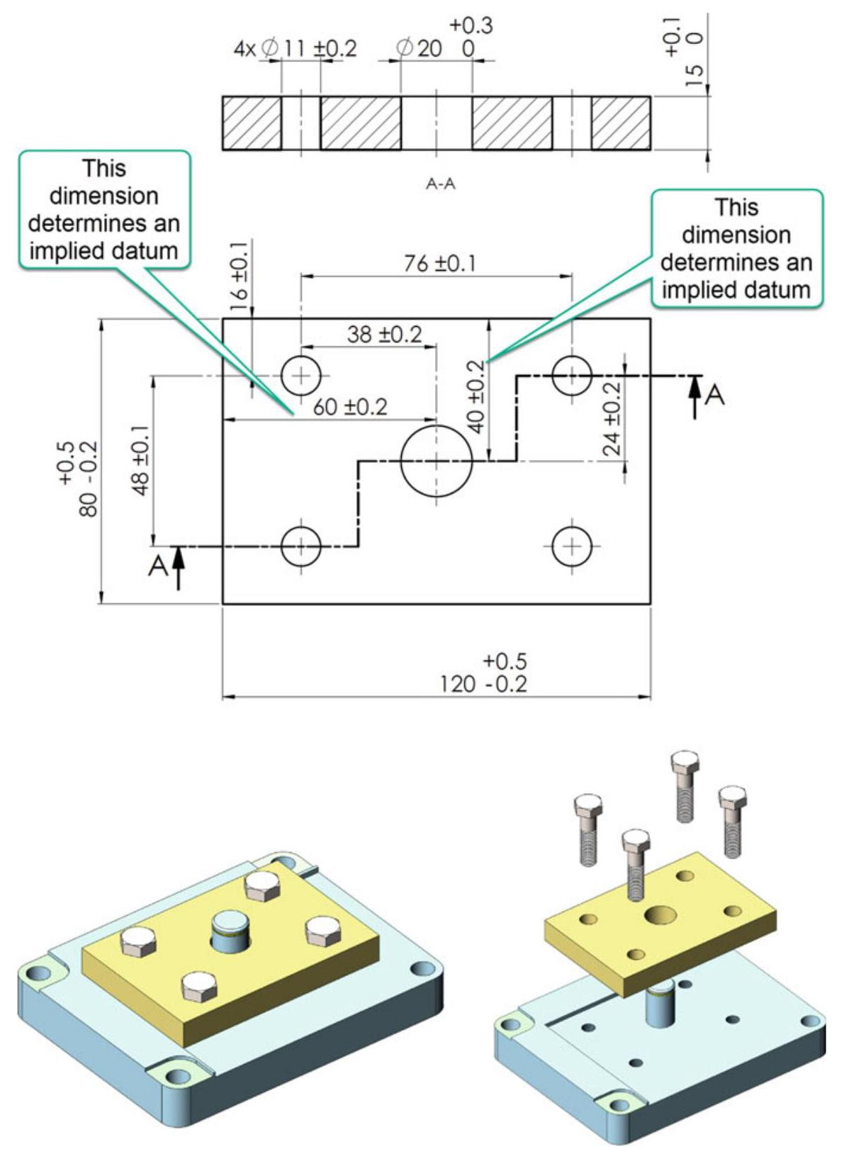 Let us consider the drawing in Fig. 1.3 of a plate with 4 holes, for which the assembly with fixed fasteners is demonstrated as an example; the traditional measurement method has been applied to the plate, that is, with the 4 holes being located according to the dimensional tolerances.