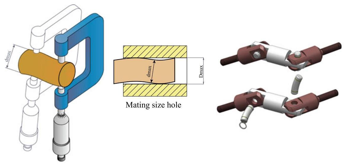 Fig. 1.2 Evaluating the mating conditions by only referring to linear distances leads to the effects of the form being neglected: a smooth f/H shaft-hole mating is in practice forced if the roundness and straightness conditions are not adequate. In fact, the measured maximum dimension, dmax, that conforms to the requested tolerance is less than the Dmax dimension that corresponds to the actual mating dimensions of the pin. Accordingly, it is not possible to fit the hinge pin with the hole because of the error in the straightness of the axis