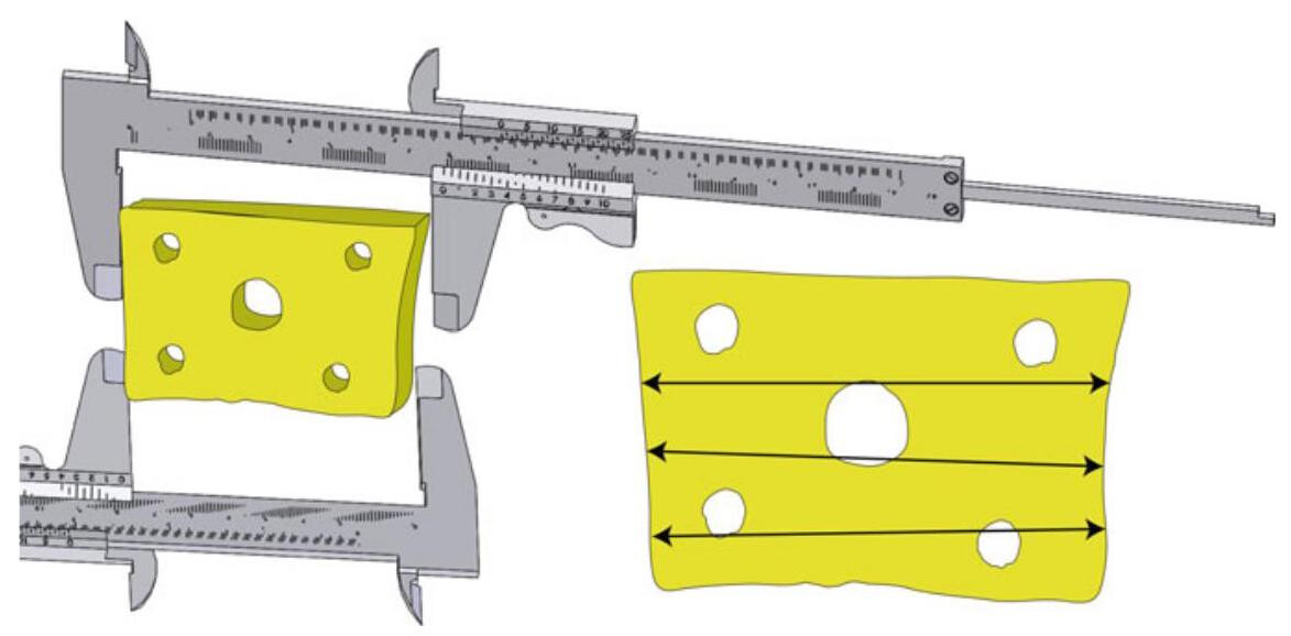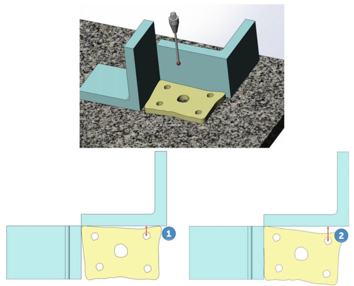 Fig. 1.5 Without any indication of the datums, the control of the position of the holes is not univocal or repeatable (measurements 1 and 2 give different results, according to the support system of the part used during the verification)