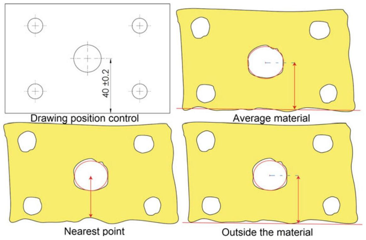 Fig. 1.7 The control of the position of a hole may be achieved by resorting to of the use of ideal circles and surfaces (known as associated geometry in the ISO system). The three verification methodologies shown in the figures could furnish contrasting results