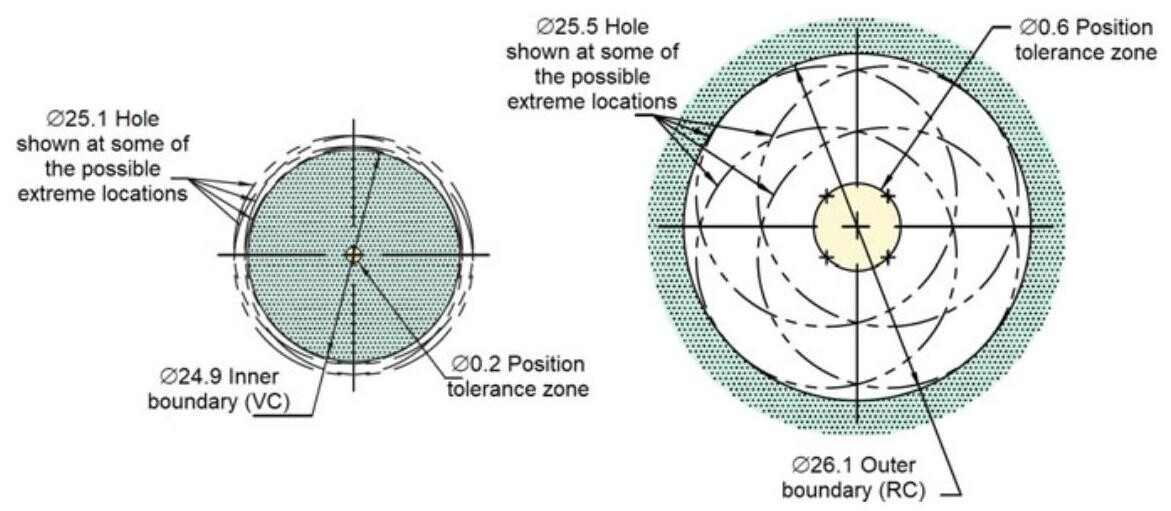 Fig. 5.23 Virtual and Resultant Condition Boundaries for an internal feature, using an MMC modifier