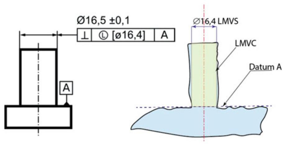 The least material requirement can also be characterised by a collective requirement pertaining to the size and the geometrical deviation of the feature of size. When a designer introduces the LMR symbol, he/she defines a geometrical feature of the same type and of perfect form, with a value equal totheLeast Material Virtual Size (LMVS) which limits the real feature on the inside of the material.
