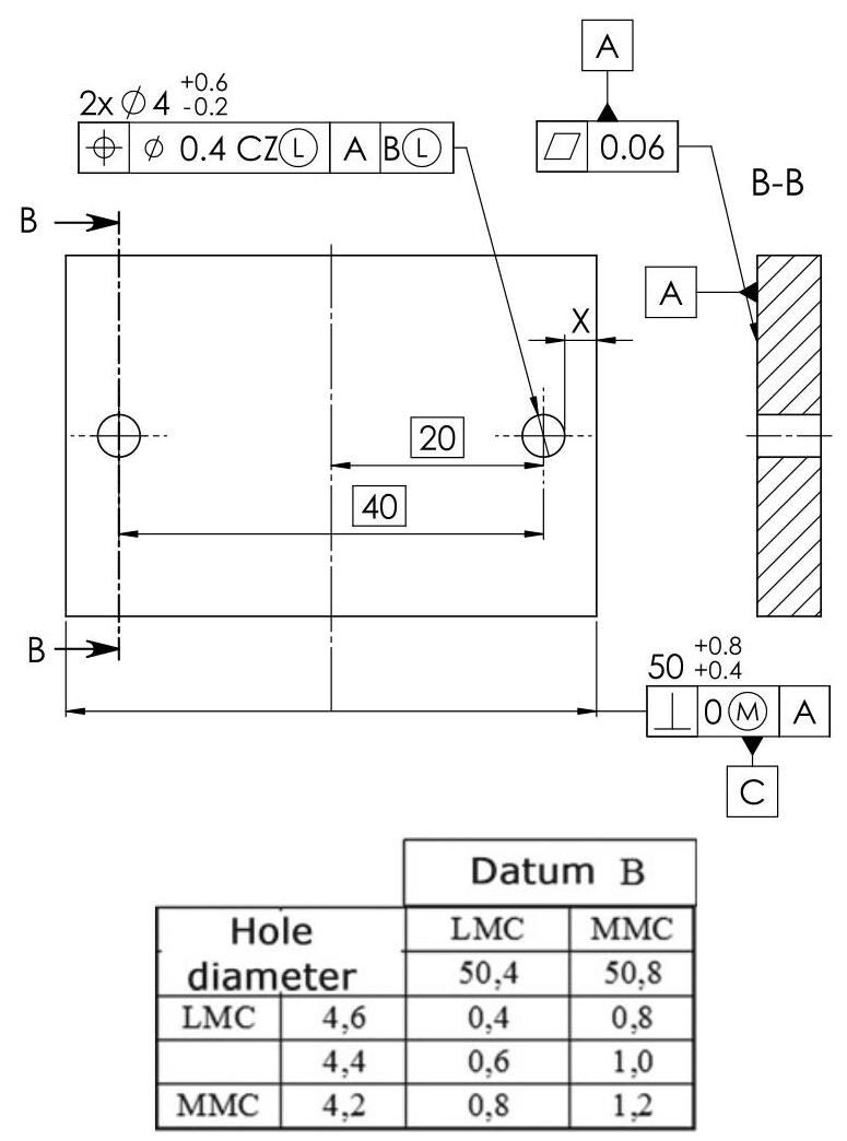 The 4mm hole in the plate in Fig. 5.5 has an LMVC of 5mm ,which is obtained by adding the tolerance of 0.4mm from the minimum material size (LMS) of 4.6mm . For internal features of size, LMVS is obtained from the formula: