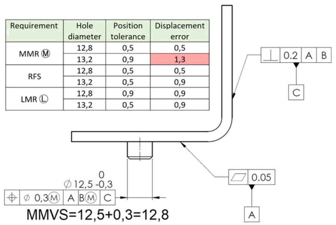 The decision to choose an RFS, MMR, LMR or RPR requirement depends on the function of the workpiece. MMR is generally chosen when the parts have to be assembled with a mating with clearance (i.e. fixed fastener), but it is useful to allow additional maximum tolerances to reduce the manufacturing costs.