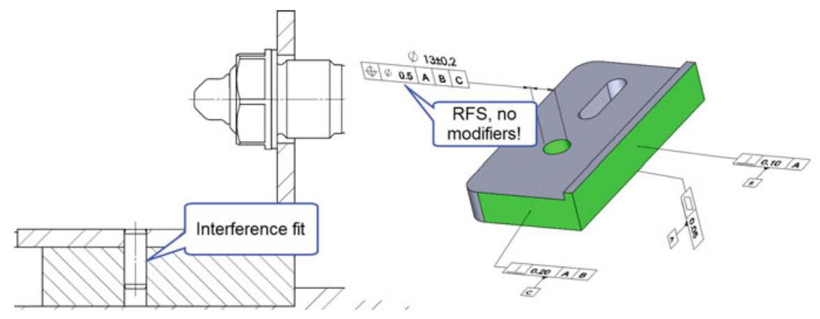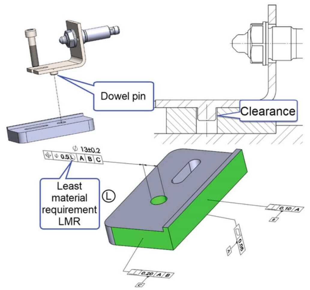 LMR is useful when a designer has the goal of guaranteeing a minimum distance or a critical wall thickness. RPR is used to enlarge the size tolerance, for example, in a non-functional assembly. Finally, RFS (without any modifier) is used when any additional tolerance, such as the control of a position tolerance of a locating pin, can compromise the functionality of the workpiece.