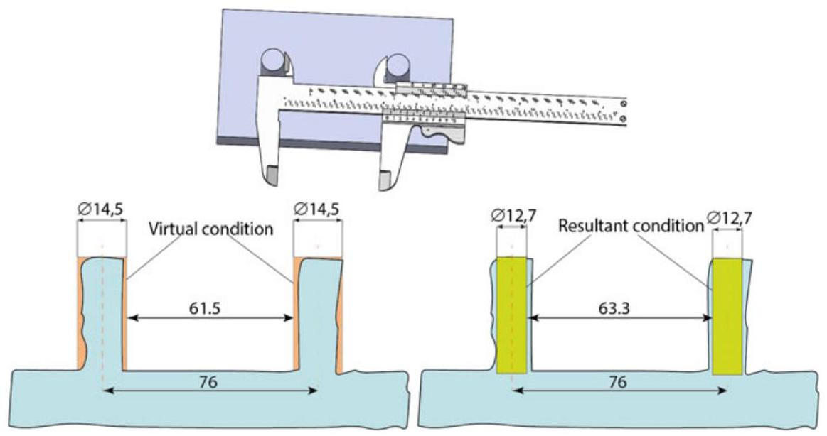 The consequence is that the prescribed tolerances can in practice be enlarged, without compromising the possibility of mating, when the actual dimensions of the features that have to be mated do not reach the values corresponding to the maximum material condition (Fig. 5.1).